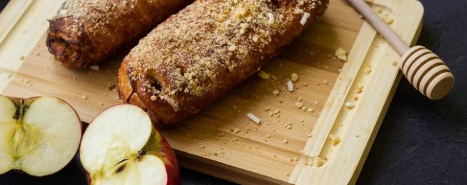 Il rotolo al miele con le mele si prepara in modo molto semplice e veloce, poiché viene cotto immediatamente con il ripieno e non necessita nemmeno di un frullatore. Il tenero biscotto al miele si sposa bene con le mele.