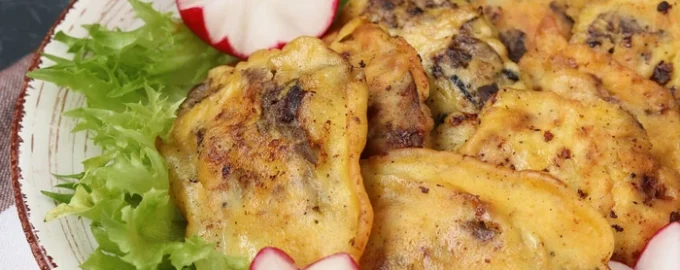 Friggere il fegato preparato in una pastella di cipolla, panna acida, uovo, senape e pepe nero macinato.